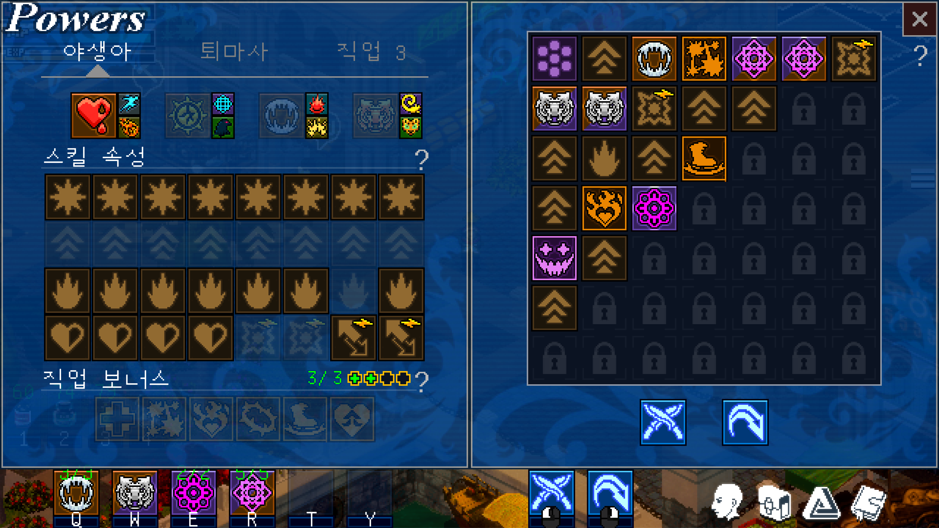 직업 스킬을 오른쪽 스킬판에 배치해서 강화시키는 방식